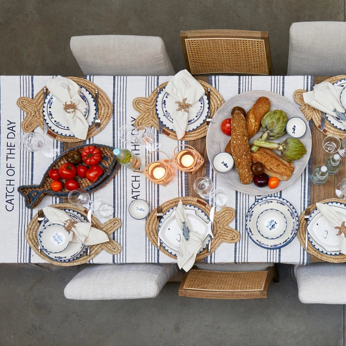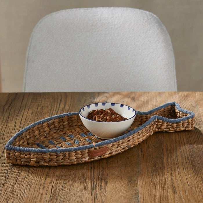 Bringe einen Hauch von maritimem Charme in dein Zuhause mit diesem schönen Tablett in Form eines Fisches. Aus gewebter Wasserhyazinthe gefertigt und mit blauen Details verziert, verleiht es deinem Interieur einen verspielten und stilvollen Twist. Ideal, um es zu benutzen oder einfach als Blickfang abzustellen!