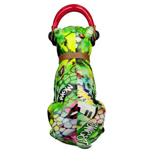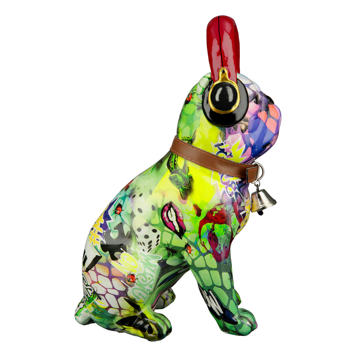 Mops "Street Art" sitzend mit Kopfhörer, mehrfarbig - mit Halsband und Glocke