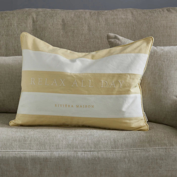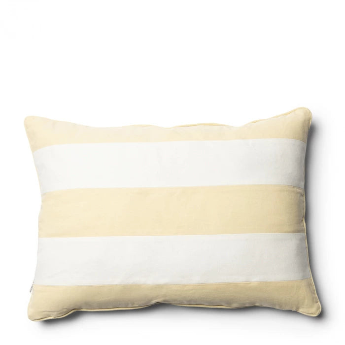 Tauschen Sie die Winterfarben gegen einen frischen Look. Der Relax All Day Kissenbezug ist ein rechteckiger Kissenbezug mit breiten weißen und hellgelben Streifen. Perfekt, um das Wohnzimmer zu verschönern. Hinweis: ohne Innenkissen.